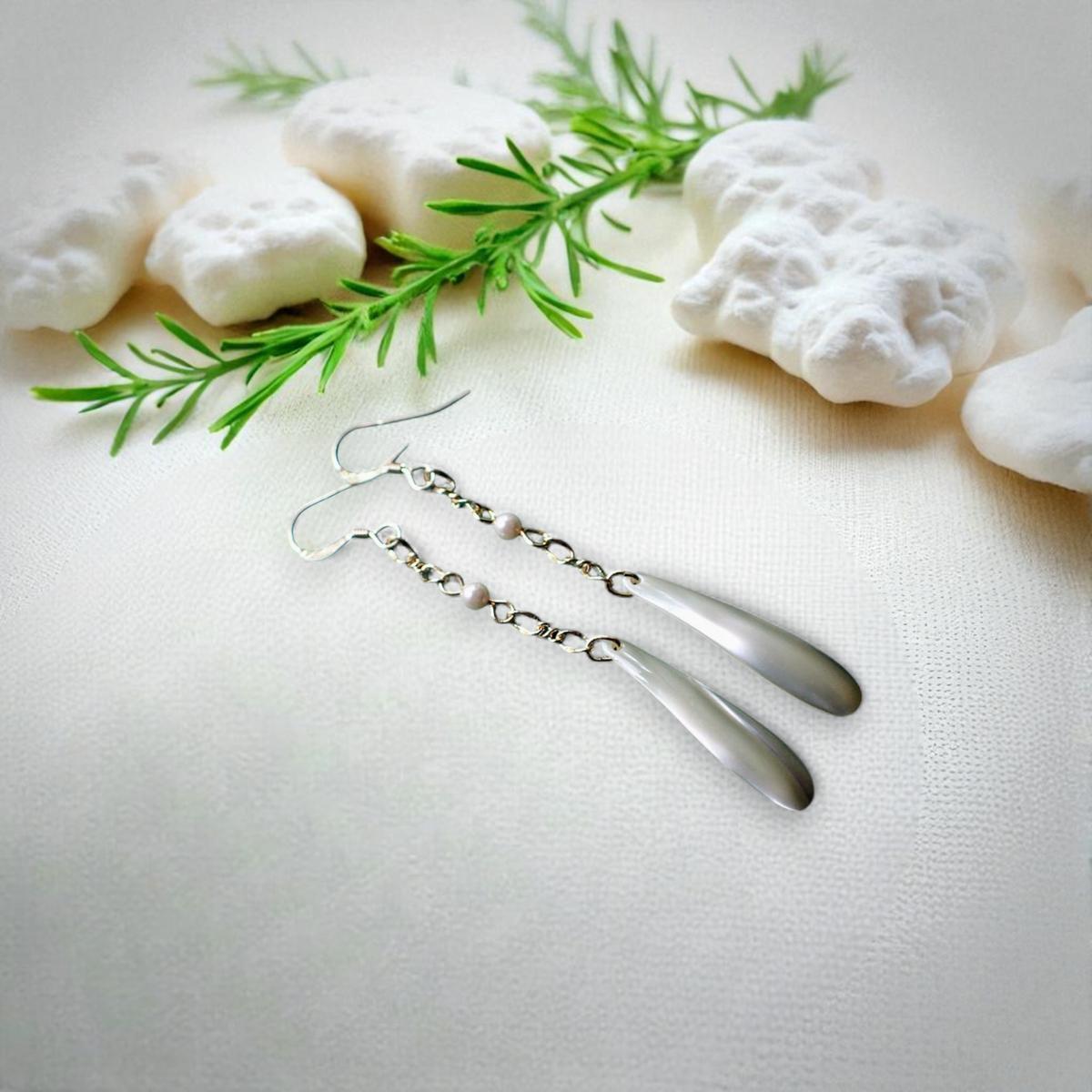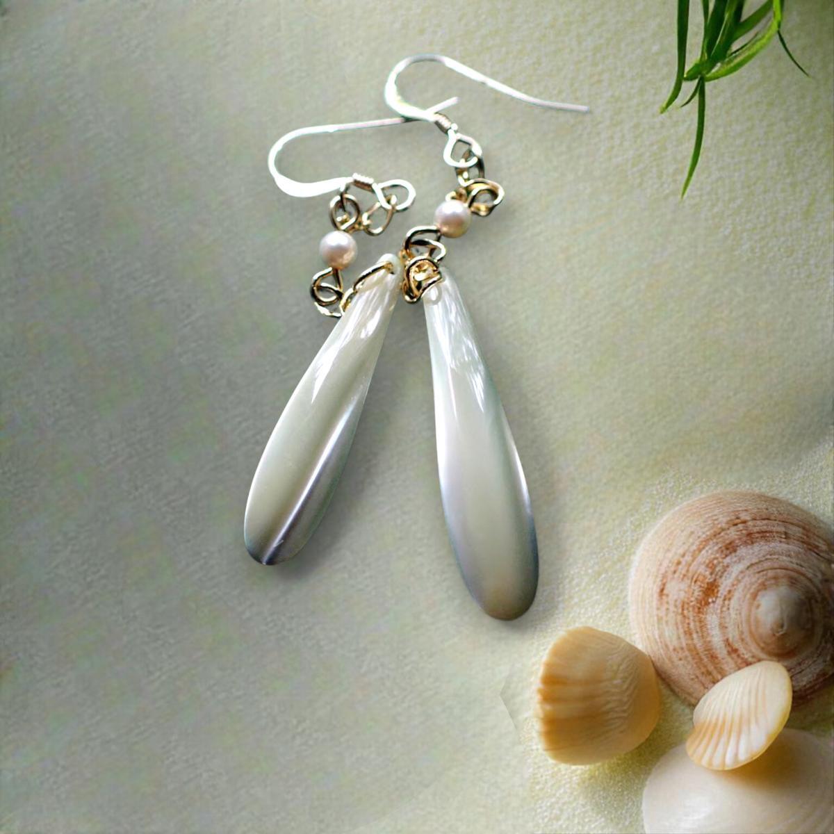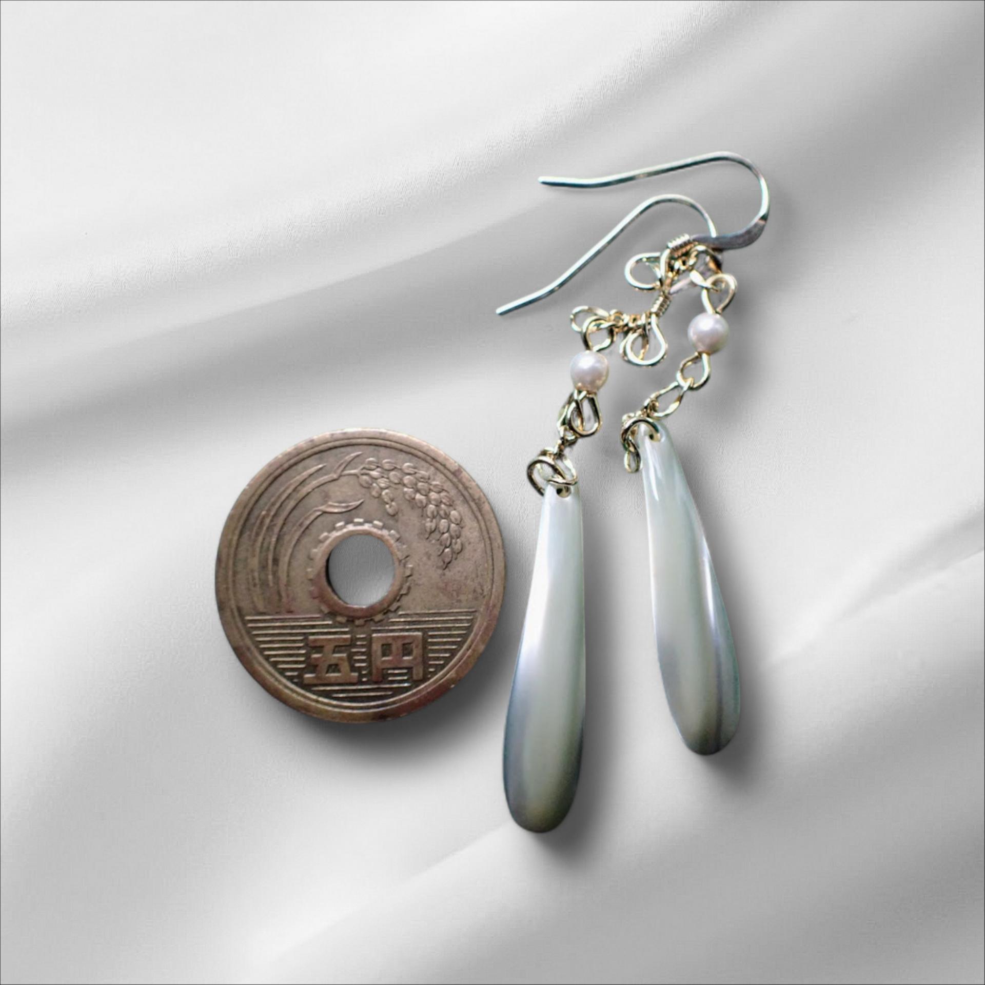 沖縄の海で育まれた夜光貝から、真珠層の美しい部分だけを丁寧に削り出したしずく型のピアスです。